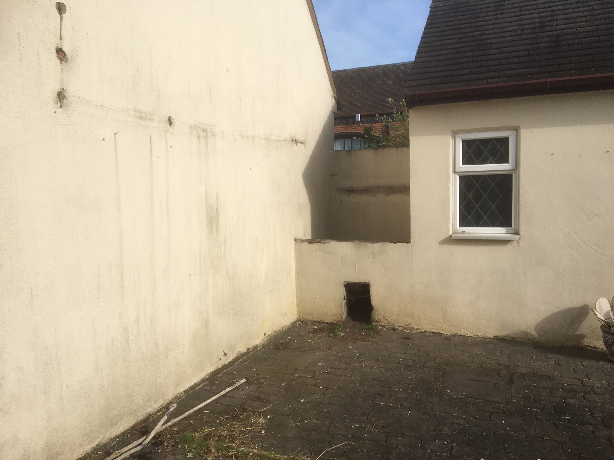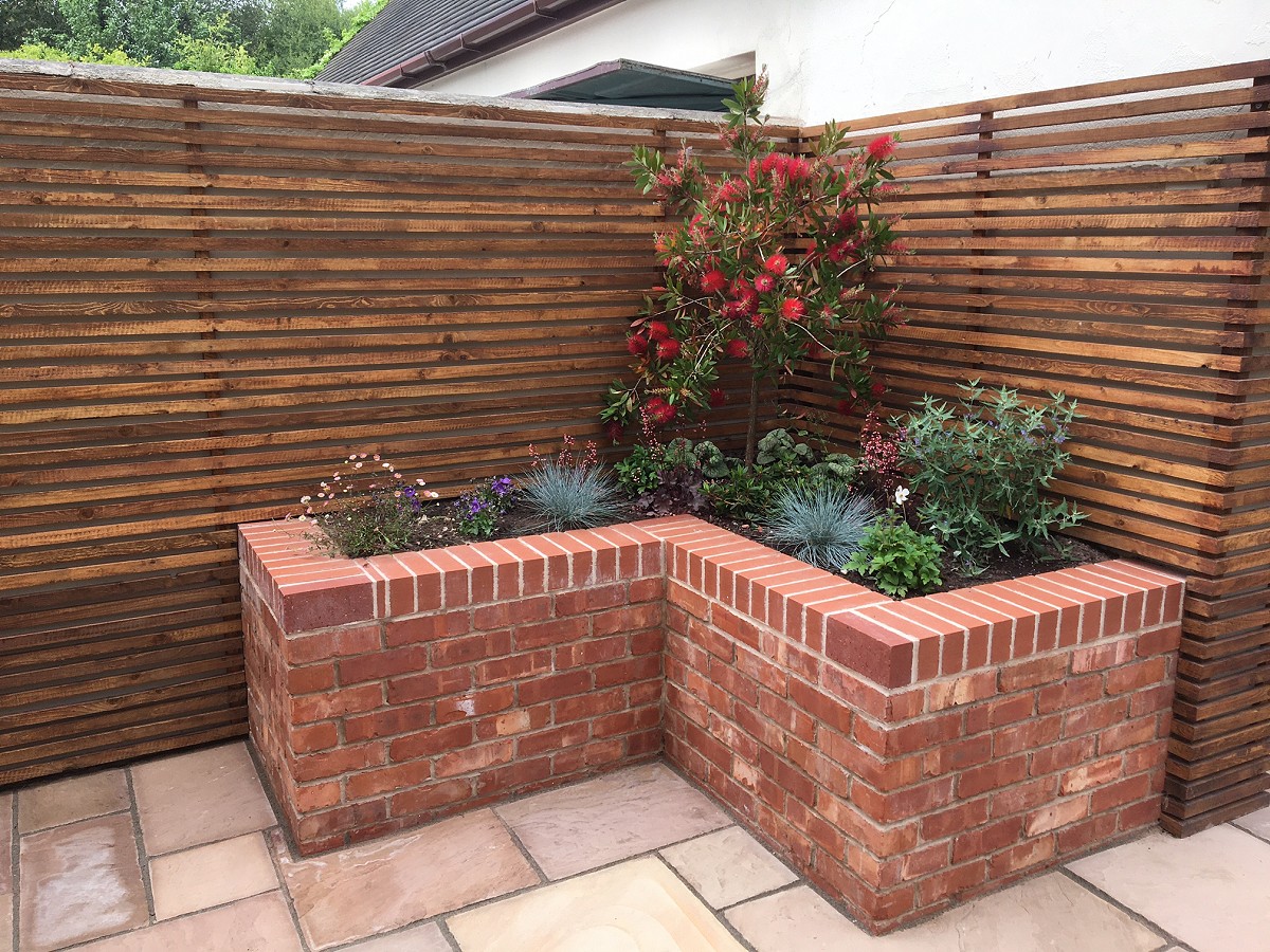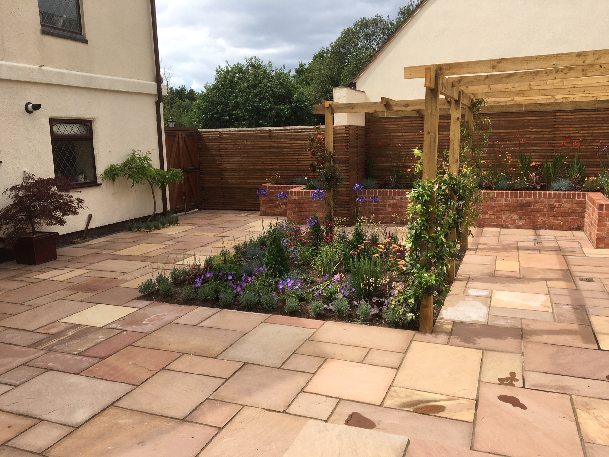 Walls were removed, a new boundary wall installed and internal walls clad in light oak stained lath screening to give a sleek contemporary flow, replacing cracked and flaking render.