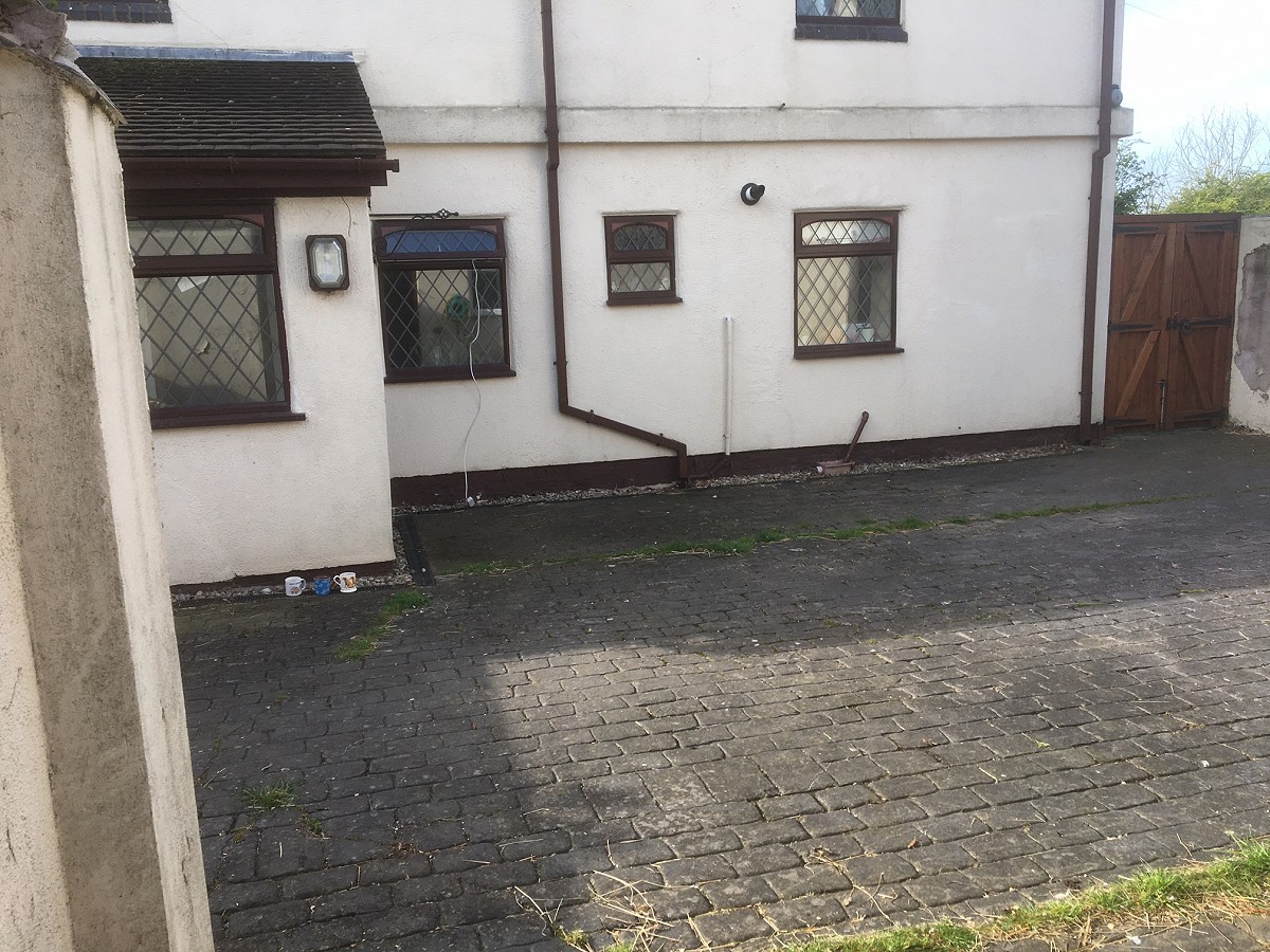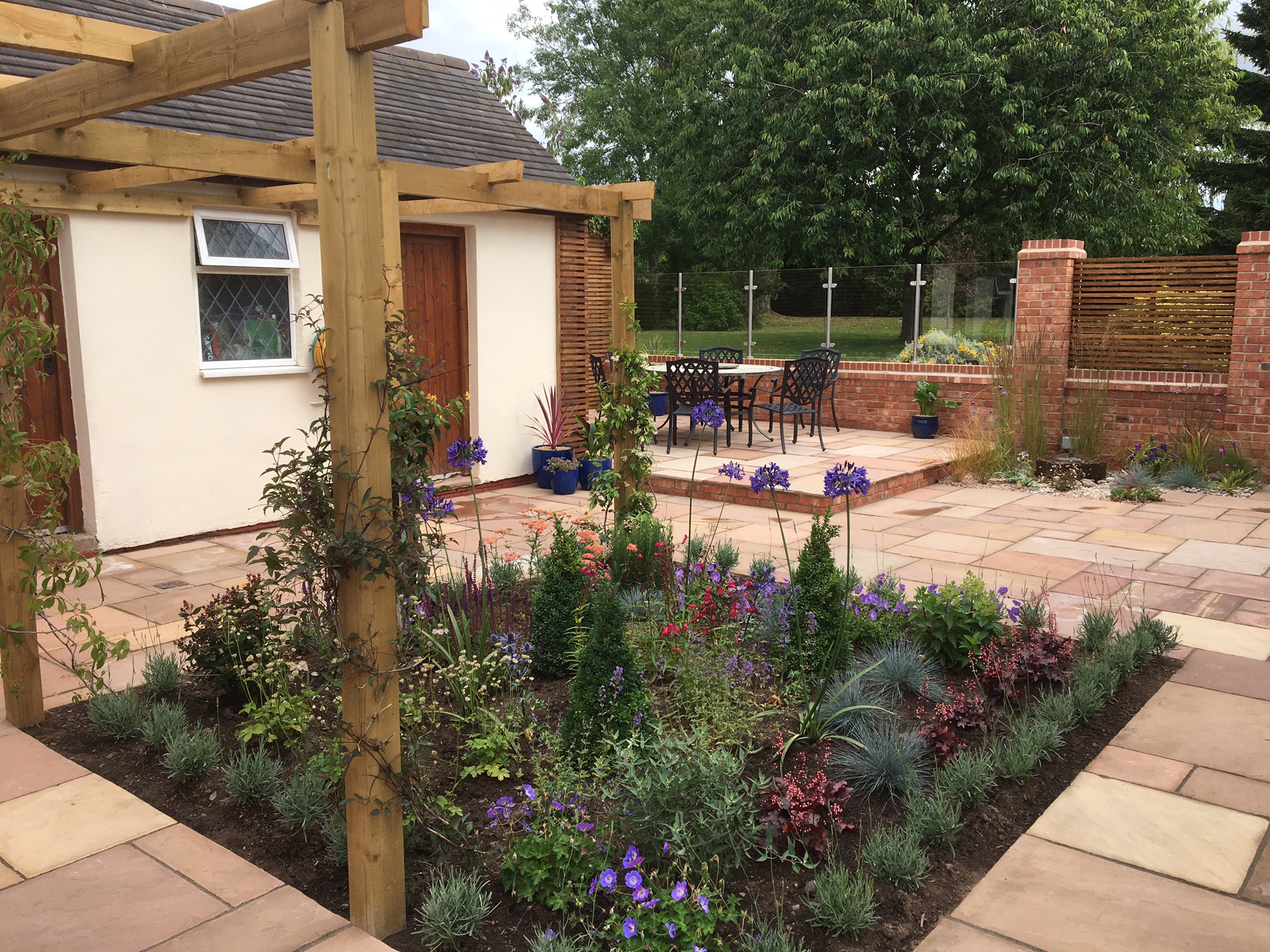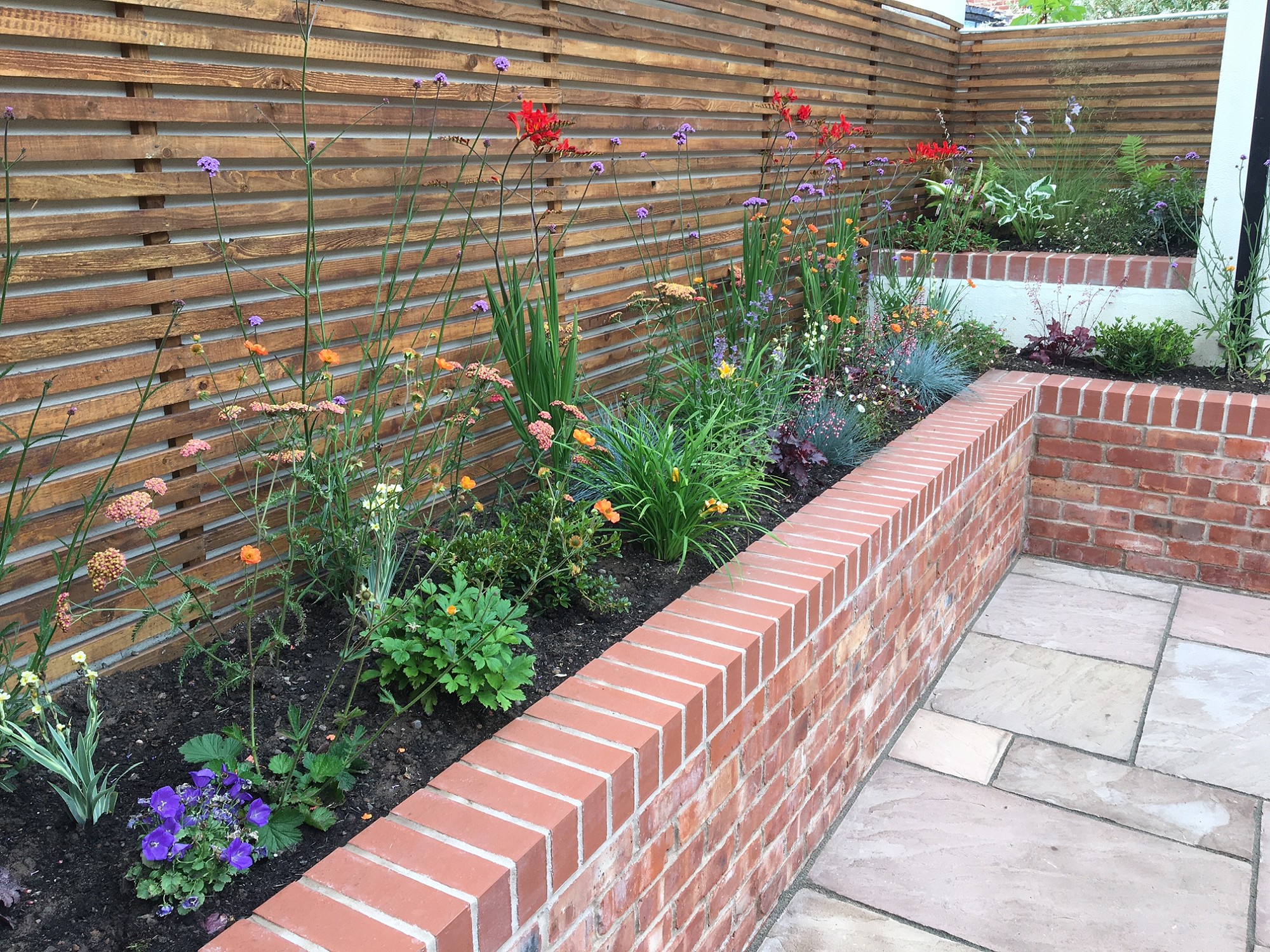 Walls were removed, a new boundary wall installed and internal walls clad in light oak stained lath screening to give a sleek contemporary flow, replacing cracked and flaking render.