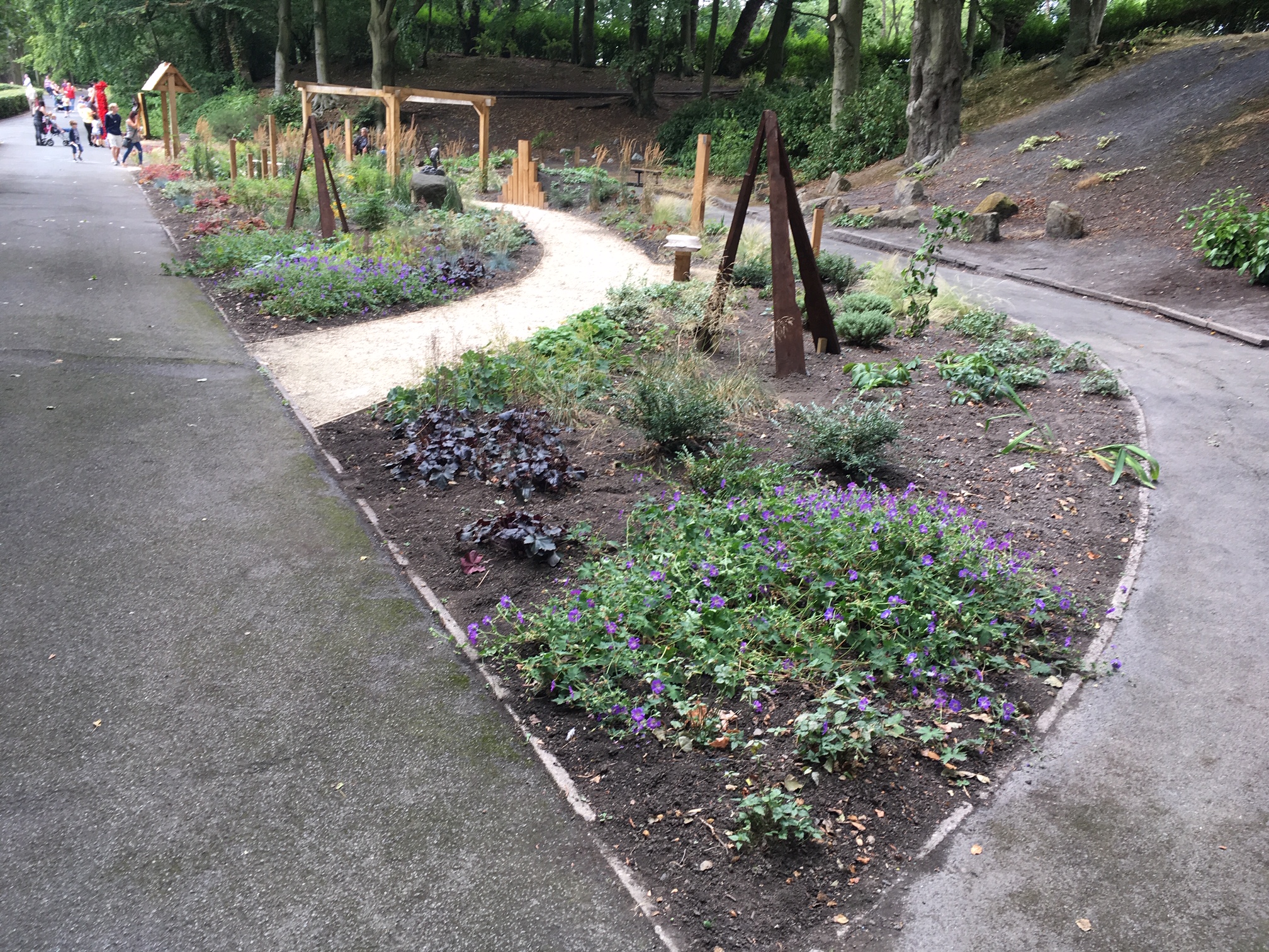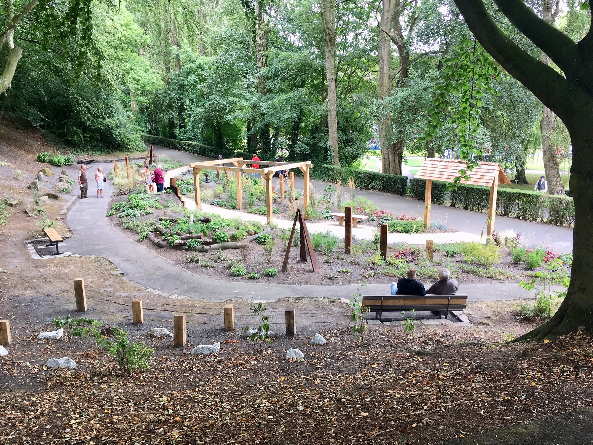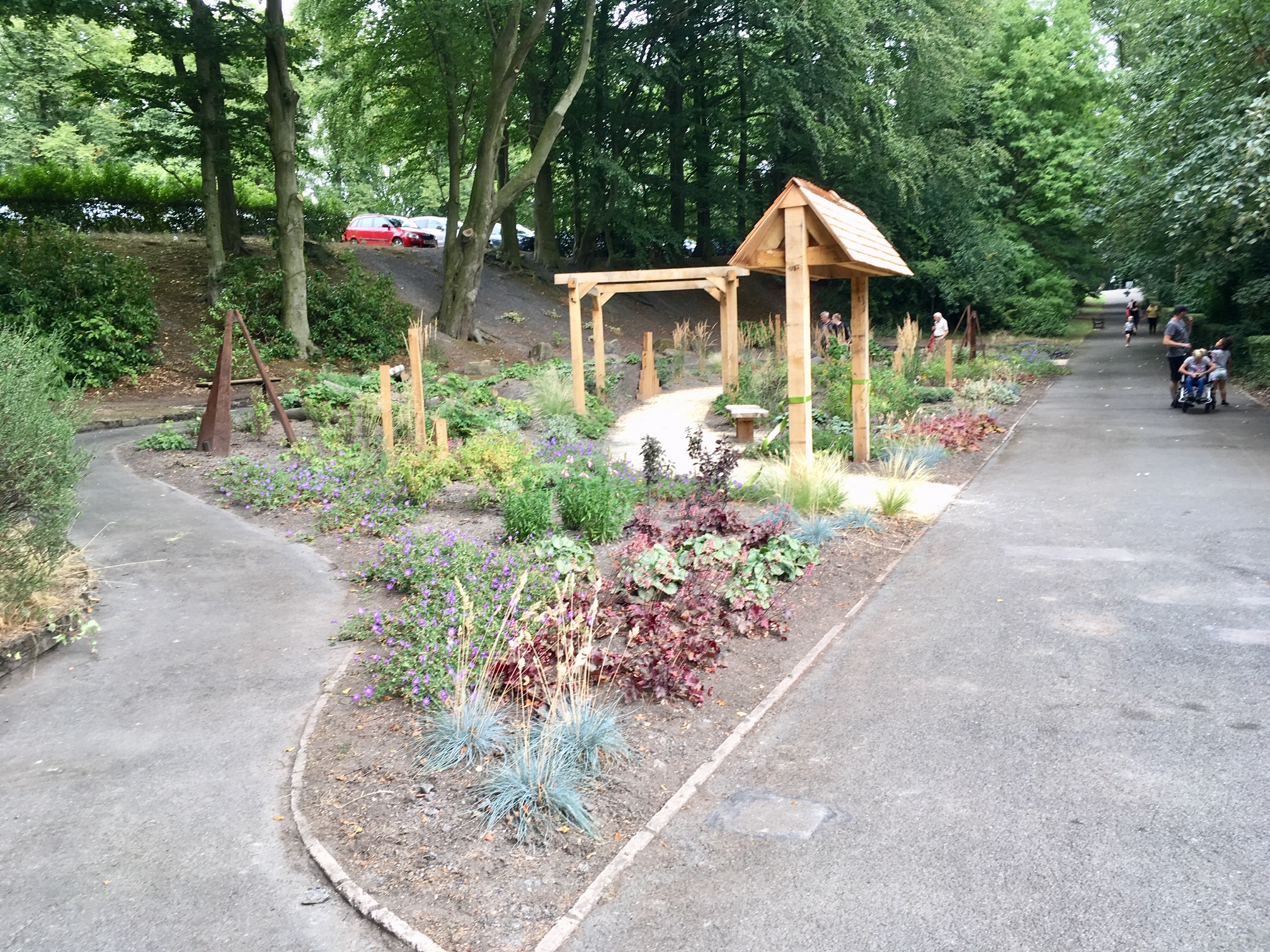 The pergola of peace where roses ‘Peace’ and ‘Serenity’ clothe it’s oak beams and a stumpery reflects the fallen returning to nature. All this is pulled together by a naturalistic planting style and a pathway to meander peacefully.